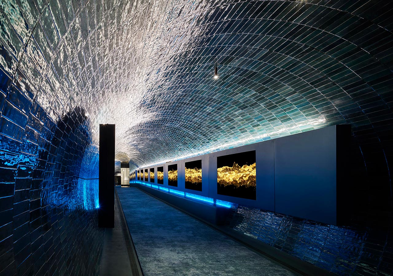 L’obiettivo di tutti gli interventi è chiaro: garantire una perfetta continuità dell’impermeabilizzazione in un contesto con una costante presenza di acqua in pressione e un drenaggio della struttura permanentemente in funzione. Il risultato è davvero degno di nota: il rivestimento di piastrelle a forma rettangolare che ricopre l’intero tunnel e il pavimento in microcemento, che si inserisce perfettamente in un contesto che vede la presenza di monitor alle pareti e sedute per permettere una maggior accoglienza degli ospiti alla mostra, rende questa location unica e suggestiva, perfetta per accogliere una sala esposizioni così esclusiva e prestigiosa.